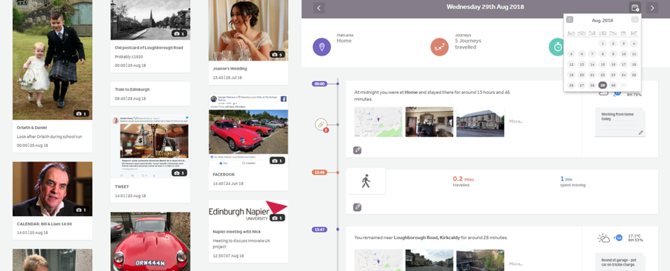 A 1-timeline proof-of-concept iOS app was tested on 100 users with location updates enabled. In these trials the timeline was divided into daily sections with intuitive calendar navigation (this was known as the diary view). The default timeline showed the main places where users stayed and the journeys made between these places. Thus, the users digital life was broken down into a series of alternate ‘Stays’ and ‘Journeys’ and these contexts were used to form the single timeline to which items and events were attached. In addition, all the events were also available on a chronological interface with a continuous scrolling page (known as the scrapbook view). Navigation between the diary and scrapbook view was from a single click.